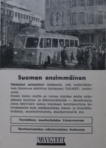 Valmetin Lentokonetehdas valmisti alumiinista lentokoneniiteillä kooten bussimatkustamoita. Alumiinilevyistä piti alun perin tehdä Bristol Blenheim -pommikoneita, mutta niistä tulikin linja-auton koreja. Trolleyliikenteen Suomessa aloittivat kotimaiset VALMET-johdinautot.